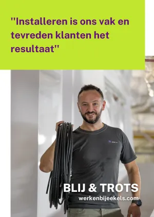 Techniek met duurzame impact! Dat is onze slogan, waarmee wij laten weten impact na te streven op de wereld om ons heen. Met onze producten en systemen blijft het niet bij woorden, maar volgen daden. Daar zijn wij ook met recht trots op! Samen werken we aan een betere morgen. Join team Eekels!